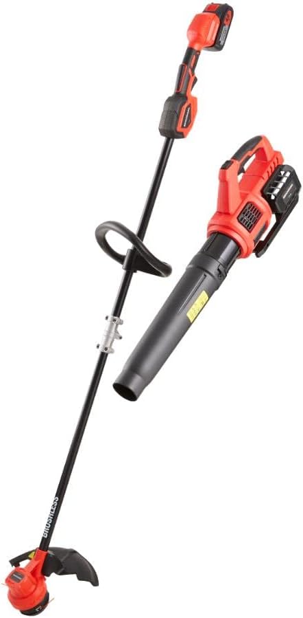 This combo kit includes a powerful 20V cordless lawn trimmer and an axial fan blower, both designed for efficient outdoor yard work. The brushless motor technology ensures higher efficiency and extended durability for both tools.