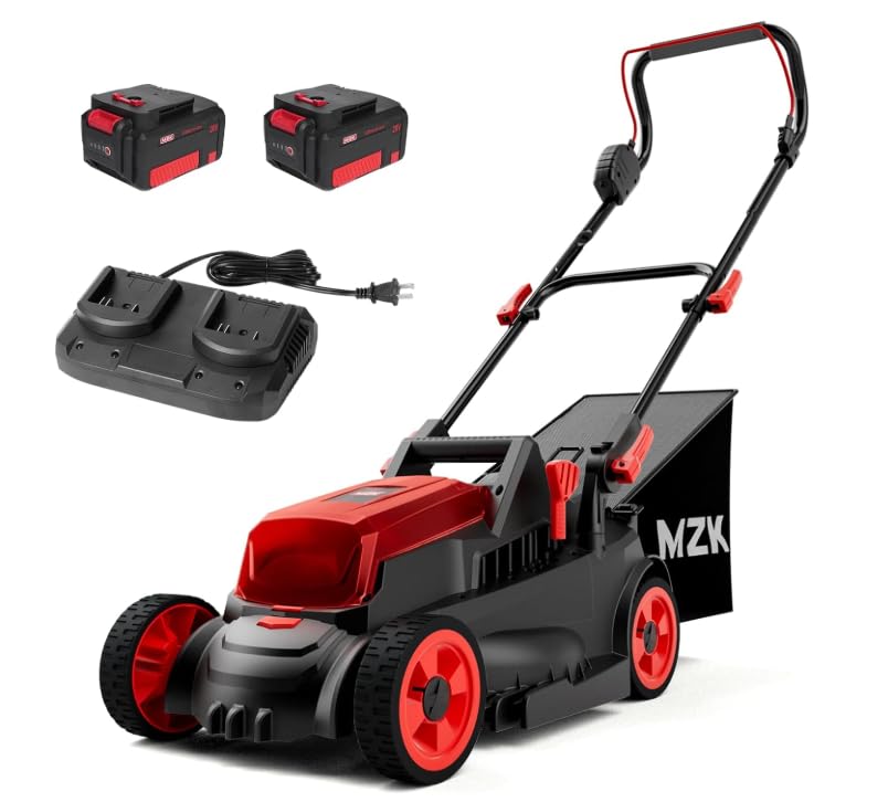Image: MZK 20V 13-inch Cordless Electric Lawn Mower. This image displays the complete lawn mower unit, highlighting its compact design, handle, motor housing, and grass catcher.